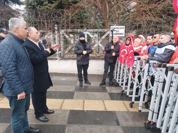 Özçelik-İş Sendikası Genel Başkanı Yunus Değirmenci liderliğinde Hatay’dan Ankara’ya gelen Yolbulan Metal işçileri, polis eşliğinde AŞTİ Ankaray durağı bölgesinden Çalışma Bakanlığı’nın önüne yürüdü.