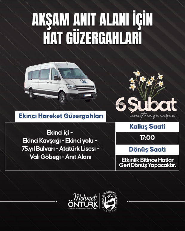 Hatay Valiliği tarafından Vali Ürgen Alan’ında saat 04.17’de düzenlenecek anma törenine Antakya’nın dört bir yanından toplamda 12 hat saat 02.30 ile 05.30 arasında ulaşım imkanı sunacak.