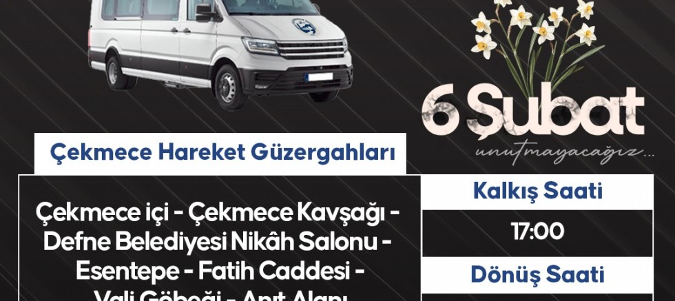 Ayrıca Hatay Medeniyetler Korosu ve Çocuk Korosu tarafından saat 18.00’de Antakya Anıt Alanı’nda gerçekleştirilecek “Ağıt Gecesi Acının ve Umudun Müziği” konserine 16.30 itibariyle toplam 12 hat hizmet verecek.
