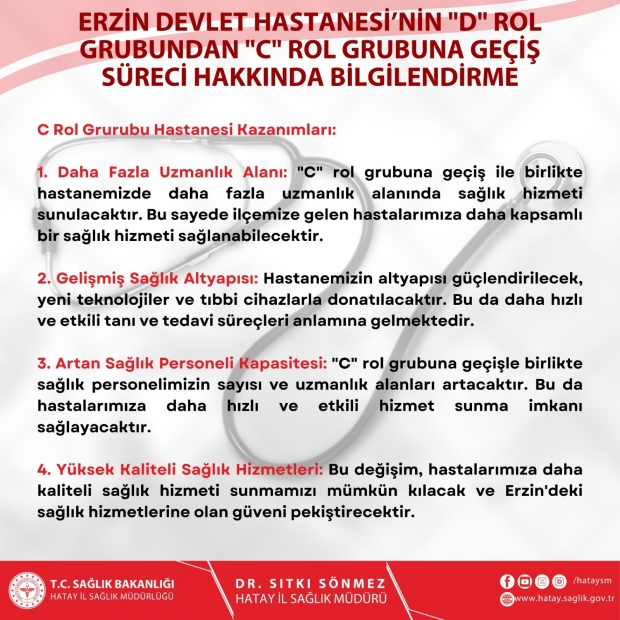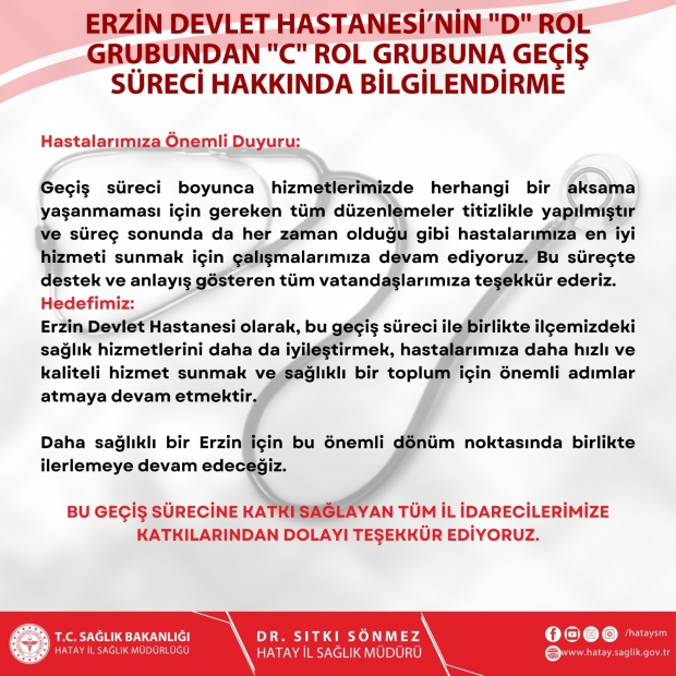 Erzin Devlet Hastanesi olarak, sağlık hizmetlerimizi sürekli olarak geliştirmek ve daha kaliteli bir sağlık hizmeti sunabilmek için önemli bir adım attık. Sağlık Bakanlığı tarafından yapılan düzenlemeler doğrultusunda hastanemiz, "D" rol grubundan "C" rol grubuna geçiş sürecini başarıyla tamamlamıştır. Bu geçiş, sağlık altyapımızın ve hizmet kalitemizin daha da iyileştirilmesi adına atılmış büyük bir adımdır.