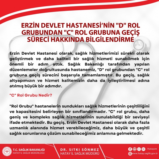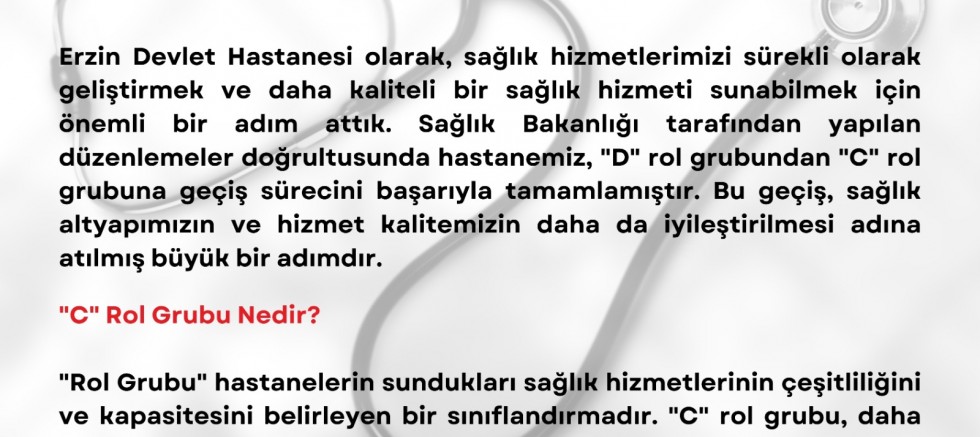"Rol Grubu" hastanelerin sundukları sağlık hizmetlerinin çeşitliliğini ve kapasitesini belirleyen bir sınıflandırmadır. "C" rol grubu, daha geniş ve kompleks sağlık hizmetlerinin sunulabildiği bir seviyeyi ifade etmektedir. Bu geçiş, Erzin Devlet Hastanesi olarak daha fazla uzmanlık alanında hizmet verebileceğimiz, daha büyük ve çeşitli sağlık sorunlarına çözüm sunabileceğimiz anlamına gelmektedir.