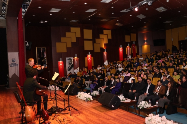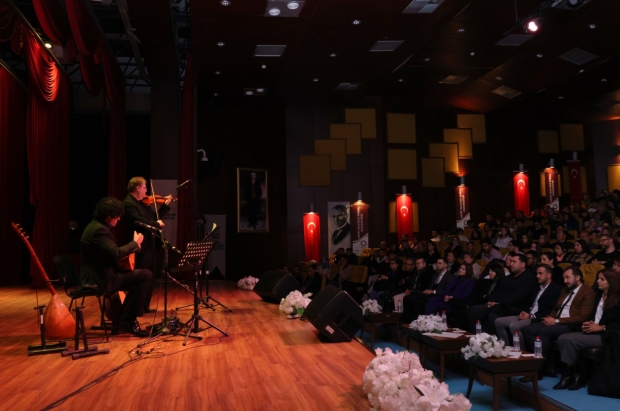 Hatay Mustafa Kemal Üniversitesi Atatürk Konferans Salonunda sahne alan Keman Virtüözü Cihat Aşkın ve Bağlama Sanatçısı Erdem Şimşek, keman ve bağlamanın eşsiz birlikteliğiyle birbirinden güzel eserleri ile dinleyenleri mest etti.